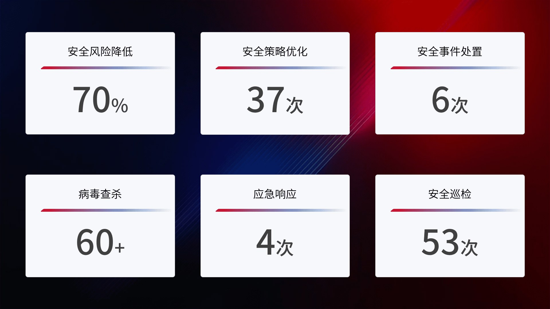 提供全面的安全事件报告体系,,,包括处置报告、、周报、、季度和年度总结,,结合持续监控,,,,帮助客户深入了解网络安全状况。。。