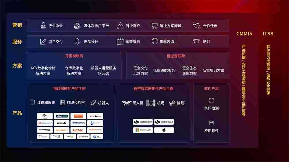 聚合国内外先进的物联网硬件产品品牌,,,,聚焦数字化仓储、、、机器人运营、、、低空智联网等领域,,,共同打造适合客户业务场景的解决方案并提供交付服务